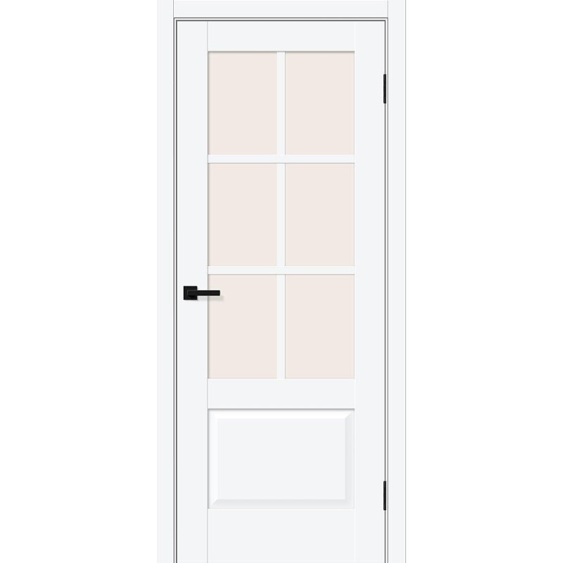 Межкомнатная остекленная дверь рамочной конструкции с объемной филенкой. Особенности: Композитный каркас двери со стабилизирующим слоем LVL или соснового бруса облицован плитами высокой плотности, без пустот. Дверь проклеена в местах соединения деталей, что обеспечивает долгий срок службы. Бескромочная технология производства, торцы защищены по технологии «2-Edge». Для отделки всех лицевых поверхностей применяется влагостойкий PUR-клей необратимой полимеризации. Крепеж из закаленной стали надежно фиксирует детали двери в 10 точках (в обычных дверях не более 6). Отделка: ПЭТ - инновационное покрытие c гладкой и приятной на ощупь поверхностью, устойчиво к повреждениям, не выцветает со временем. «Эмаль-эффект» - как эмаль, только лучше. Один из самых экологичных материалов (институт Fraunhofer IVV, Германия). Компания Bravo первой в России начала использовать 100% ПЭТ (без добавок) для промышленного производства дверей. Декор: White Silk - примерно соответствует RAL 9003, матовый (≈ 5,8 GU). Стекло: Magic Fog — белое сатинированное. Дешевое стекло с пескоструйной обработкой не используем. Комплектующие: Телескопические погонажные изделия для качественного регулируемого монтажа. Дверная коробка с TPE-уплотнителем для мягкого закрывания. Толщина, мм: 36 Масса брутто, кг: 27.1 Объем, куб.м: 0.064