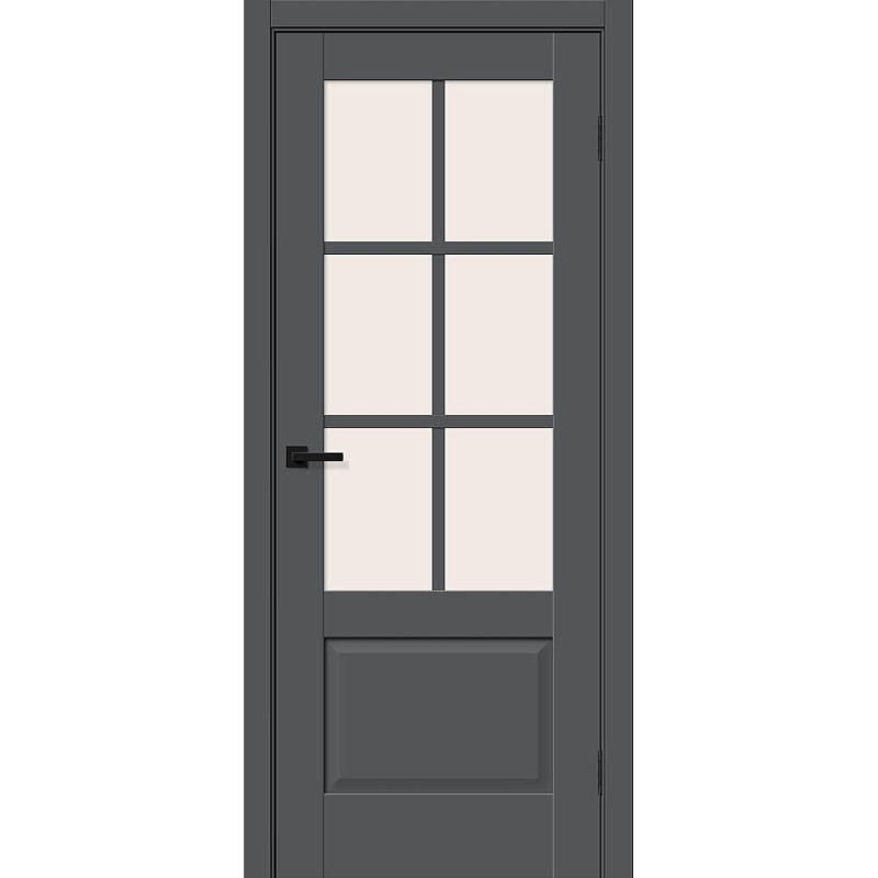 Межкомнатная остекленная дверь рамочной конструкции с объемной филенкой. Особенности: Композитный каркас двери со стабилизирующим слоем LVL или соснового бруса облицован плитами высокой плотности, без пустот. Дверь проклеена в местах соединения деталей, что обеспечивает долгий срок службы. Бескромочная технология производства, торцы защищены по технологии «2-Edge». Для отделки всех лицевых поверхностей применяется влагостойкий PUR-клей необратимой полимеризации. Крепеж из закаленной стали надежно фиксирует детали двери в 10 точках (в обычных дверях не более 6). Отделка: ПЭТ - инновационное покрытие c гладкой и приятной на ощупь поверхностью, устойчиво к повреждениям, не выцветает со временем. «Эмаль-эффект» - как эмаль, только лучше. Один из самых экологичных материалов (институт Fraunhofer IVV, Германия). Компания Bravo первой в России начала использовать 100% ПЭТ (без добавок) для промышленного производства дверей. Декор: Stormy Silk - примерно соответствует RAL 7016, матовый (≈ 3,8 GU). Стекло: Magic Fog — белое сатинированное. Дешевое стекло с пескоструйной обработкой не используем. Комплектующие: Телескопические погонажные изделия для качественного регулируемого монтажа. Дверная коробка с TPE-уплотнителем для мягкого закрывания. Толщина, мм: 36 Масса брутто, кг: 21.8 Объем, куб.м: 0.049